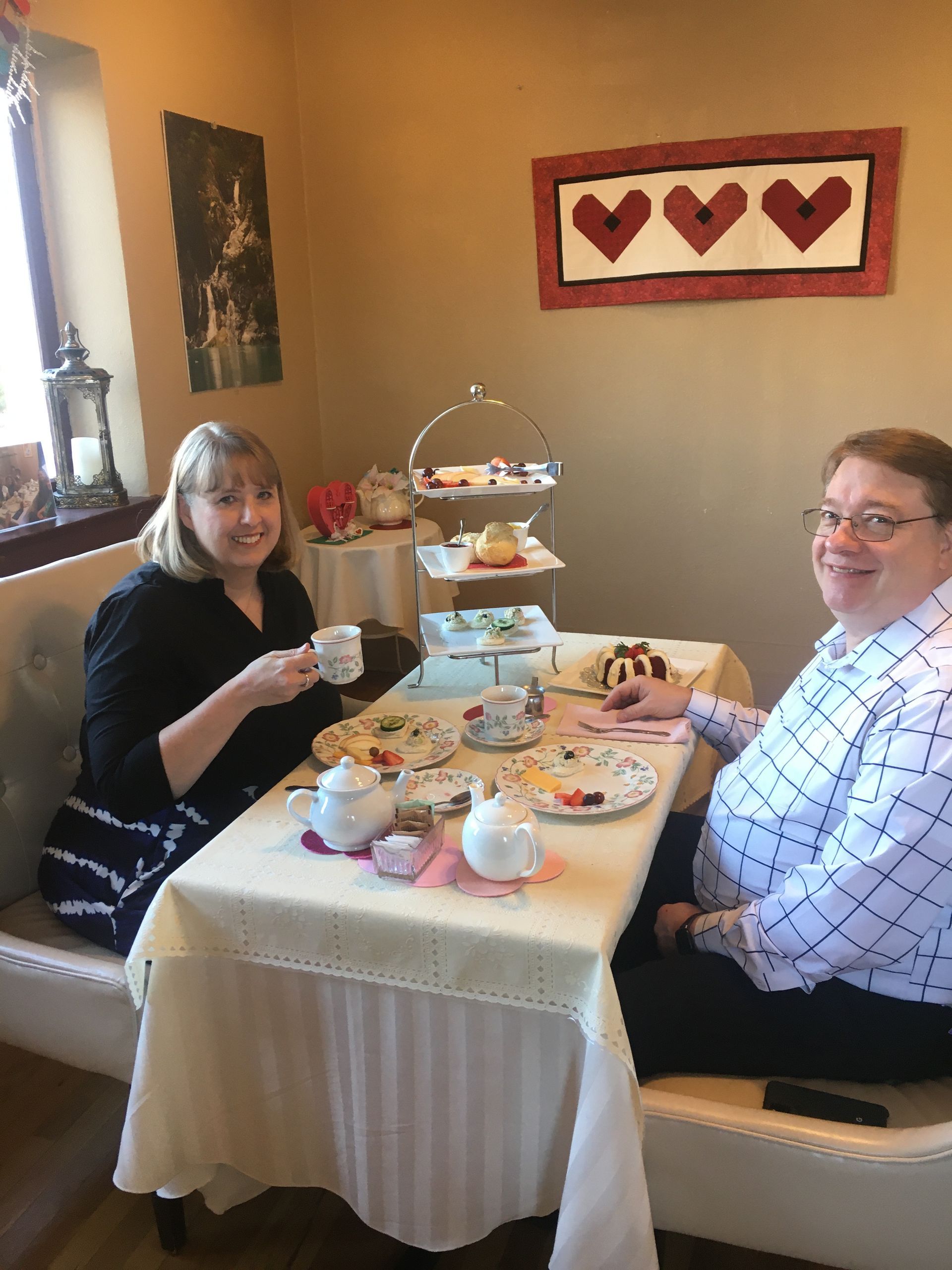 Beverage, finger sandwiches of cucumber or chicken salad or both, scones with jam and lemon curd, and dessert. $20 per person and $12 for children 12 and under.